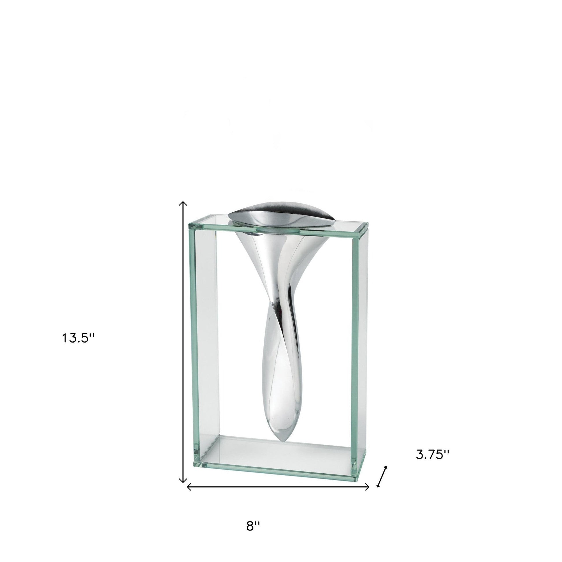 Elevate your space with the modern charm of this 14-inch clear cylinder aluminum and crystal glass table vase. Crafted with a sleek cylindrical shape, this contemporary piece features a stunning blend of aluminum and crystal glass materials in a translucent clear color. The unique design adds a touch of sophistication to any room, while the versatile style effortlessly complements a variety of home decor themes. Perfect for displaying fresh blooms or simply as a standalone decorative accent, this vase is sure to enhance the aesthetic appeal of your living space. Add a chic and elegant touch to your home with this eye-catching table vase. 13.5-inch h x 8-inch w x 3.75-inch d.