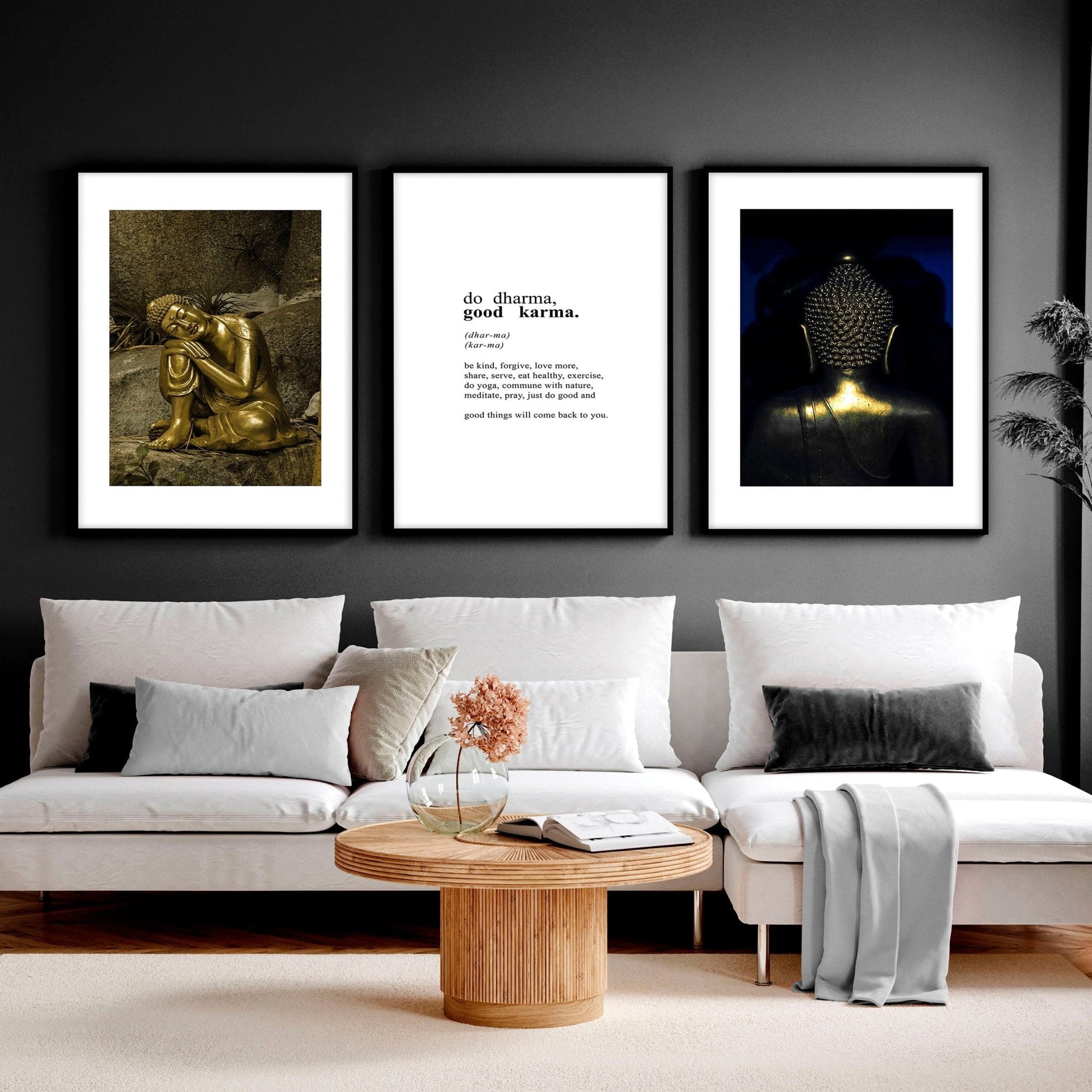 Elevate the ambience of your living room with our captivating Buddha Inspiration Quote Art. This set of three wall art prints is thoughtfully curated to bring a sense of tranquillity, mindfulness, and spiritual inspiration to your living space.