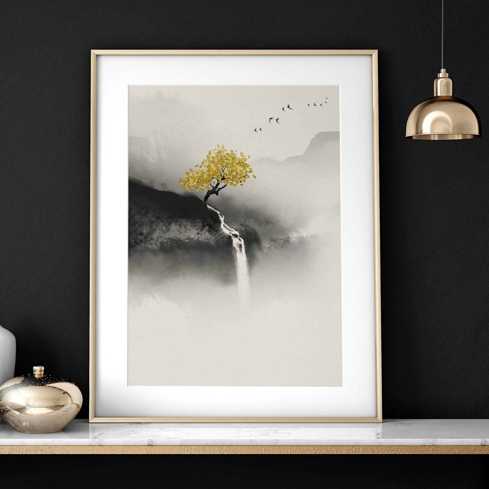Enhance your office space with the serene beauty of our set of three wall art prints featuring captivating Japanese ethereal landscapes in soothing neutral earthy tones. This collection brings the tranquil essence of a Japanese pagoda right into your workspace, creating an atmosphere of calm and relaxation.