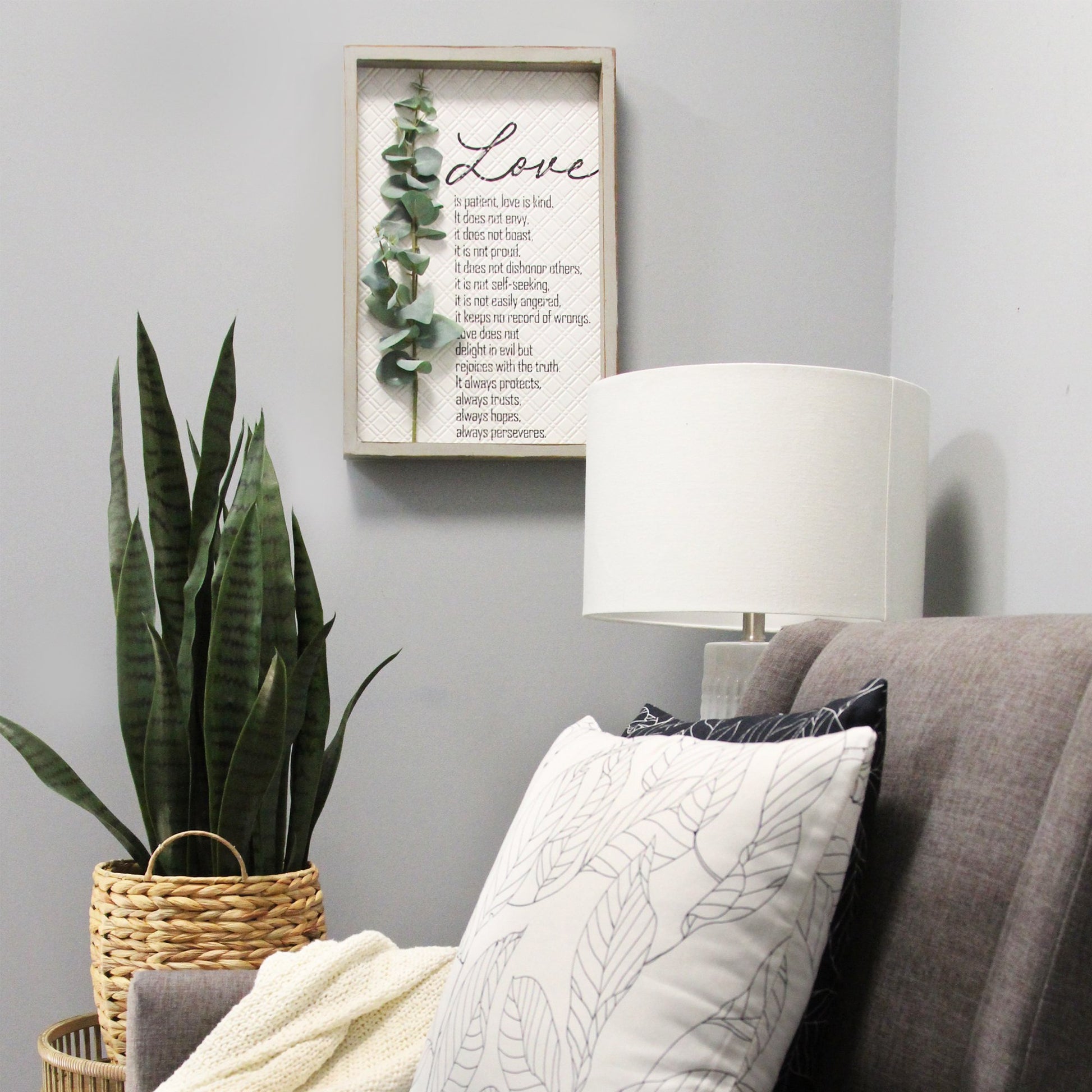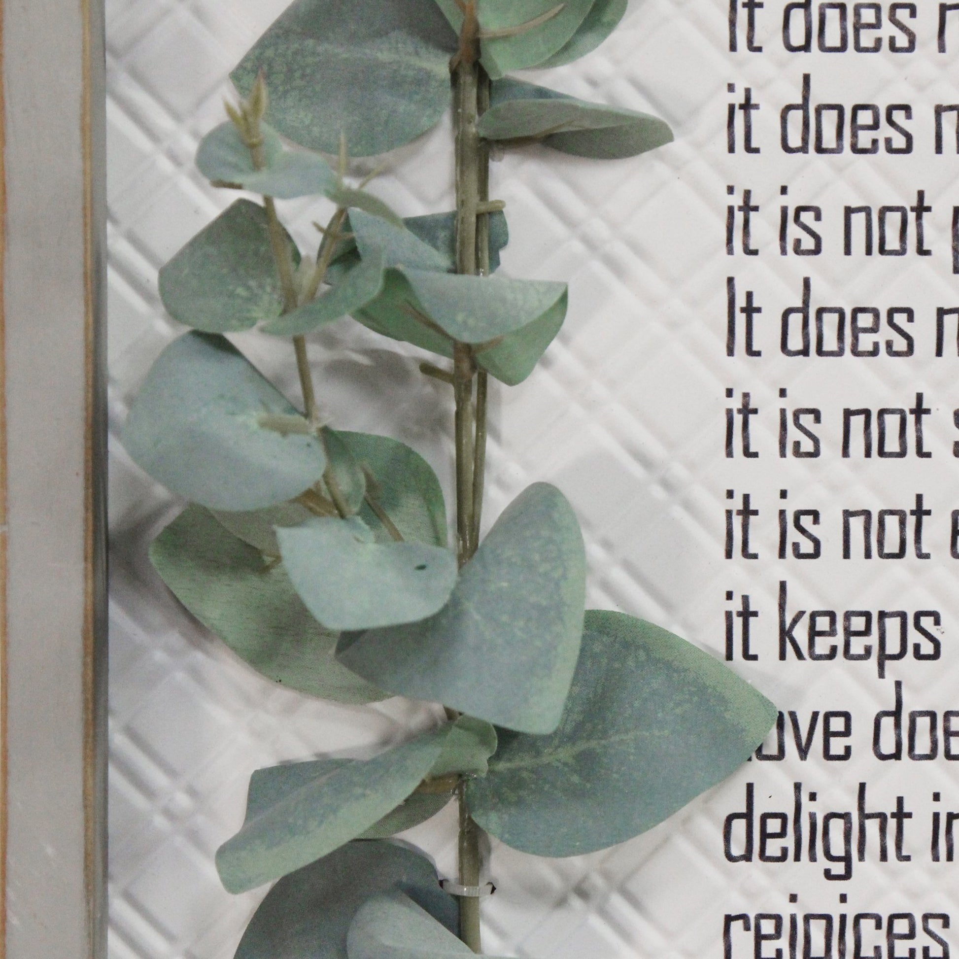 The "Love is Patient, Love is Kind" Wall Art adds a warm and tender touch to a wall. This handcrafted wood framed printed metal artwork is a perfect piece in any room, and is a sweet reminder of what is most important above all else - love. Enjoy its beautiful words and let it uplift you, your family, and friends. It comes ready to hang and measures 13.39" W x 1.77" D x 19.69" H.