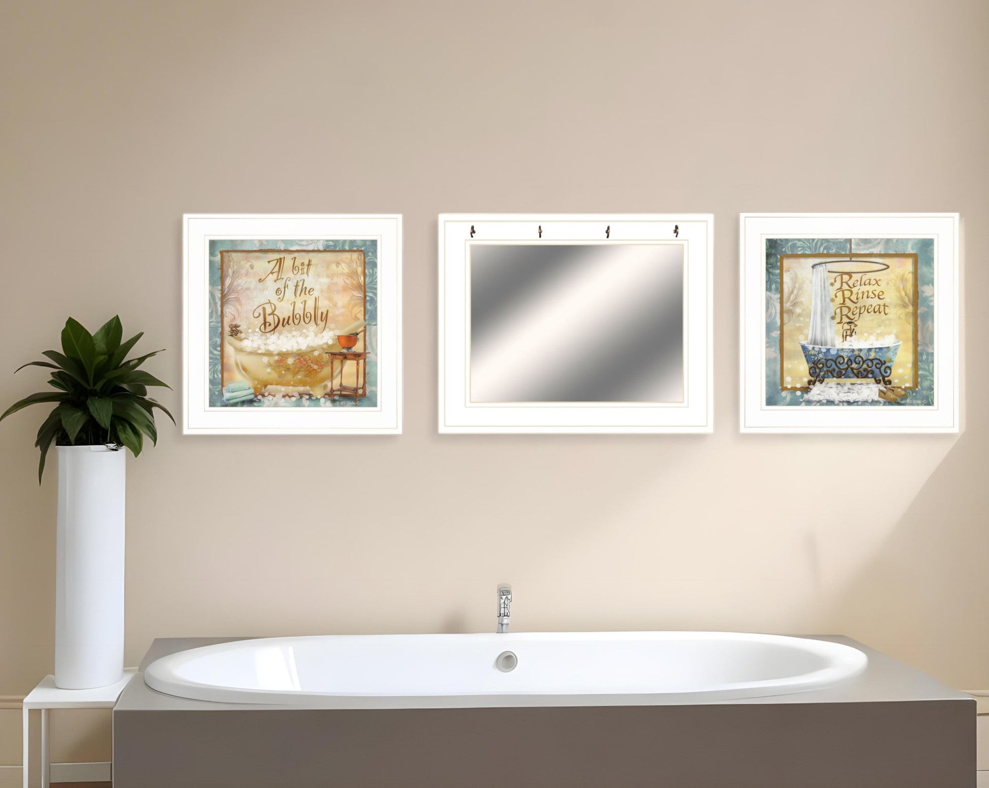 Set Of Three Bit of Bubbly White Framed Bathroom Wall Art With Mirror