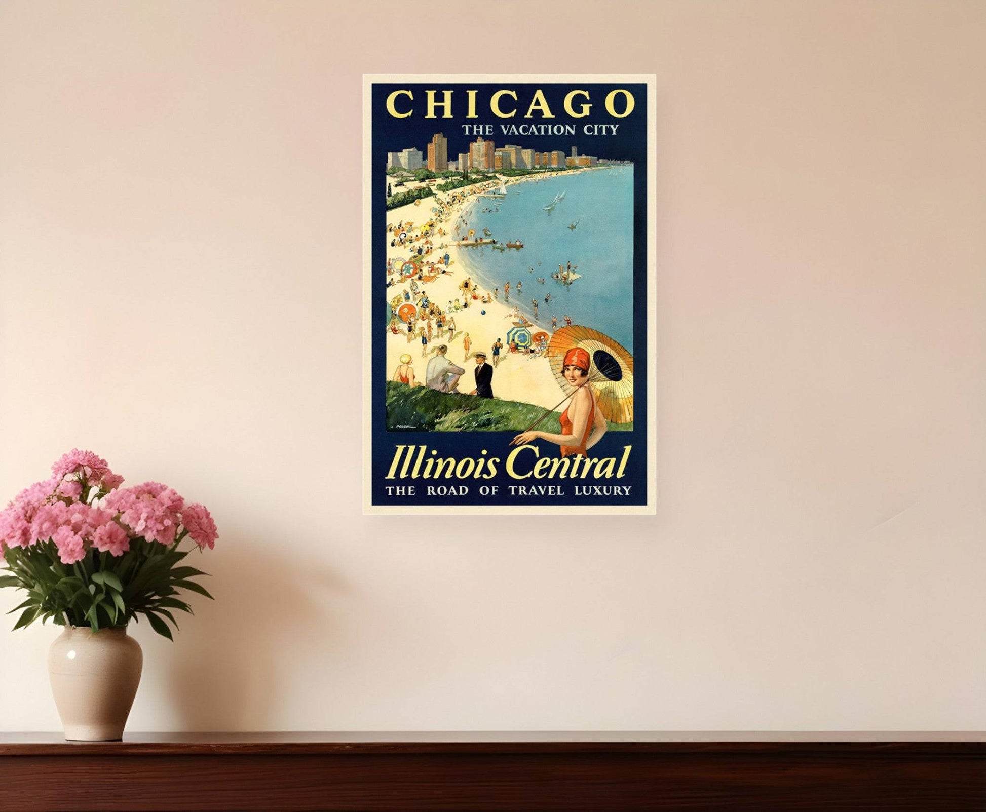 Bring some sizzle to your space with this eye-catching vintage 1929 chicago vacation travel unframed print wall art. This print is a visual artistic expression that allows you to decorate your space in style. Unframed, this flat poster art has a fresh and distinct taste to grace your walls with style. Reproduced for you on paper, this hanging decorative accent will be a trendy and fashionable way to dress your walls. Hang on your wall to add some up to date fashion and decoration. Utilize this opportunity to create a focal point in the room with this fabulous wall decor option. 54 inches H x 36 inches W x 0.1 inches D