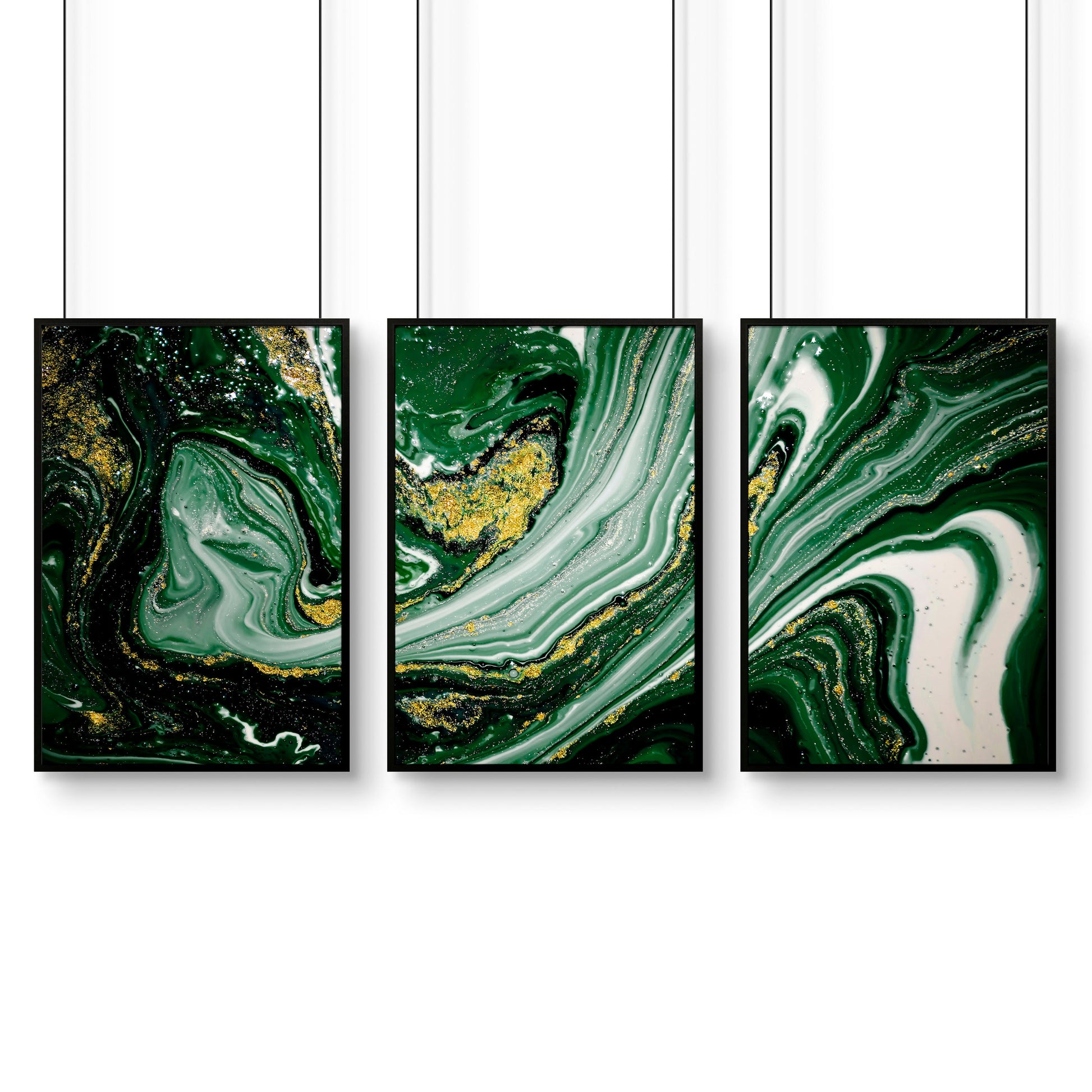Introduce a touch of modern elegance to your space with our set of three wall art prints, showcasing a captivating marble texture in deep forest green and luxurious gold tones.