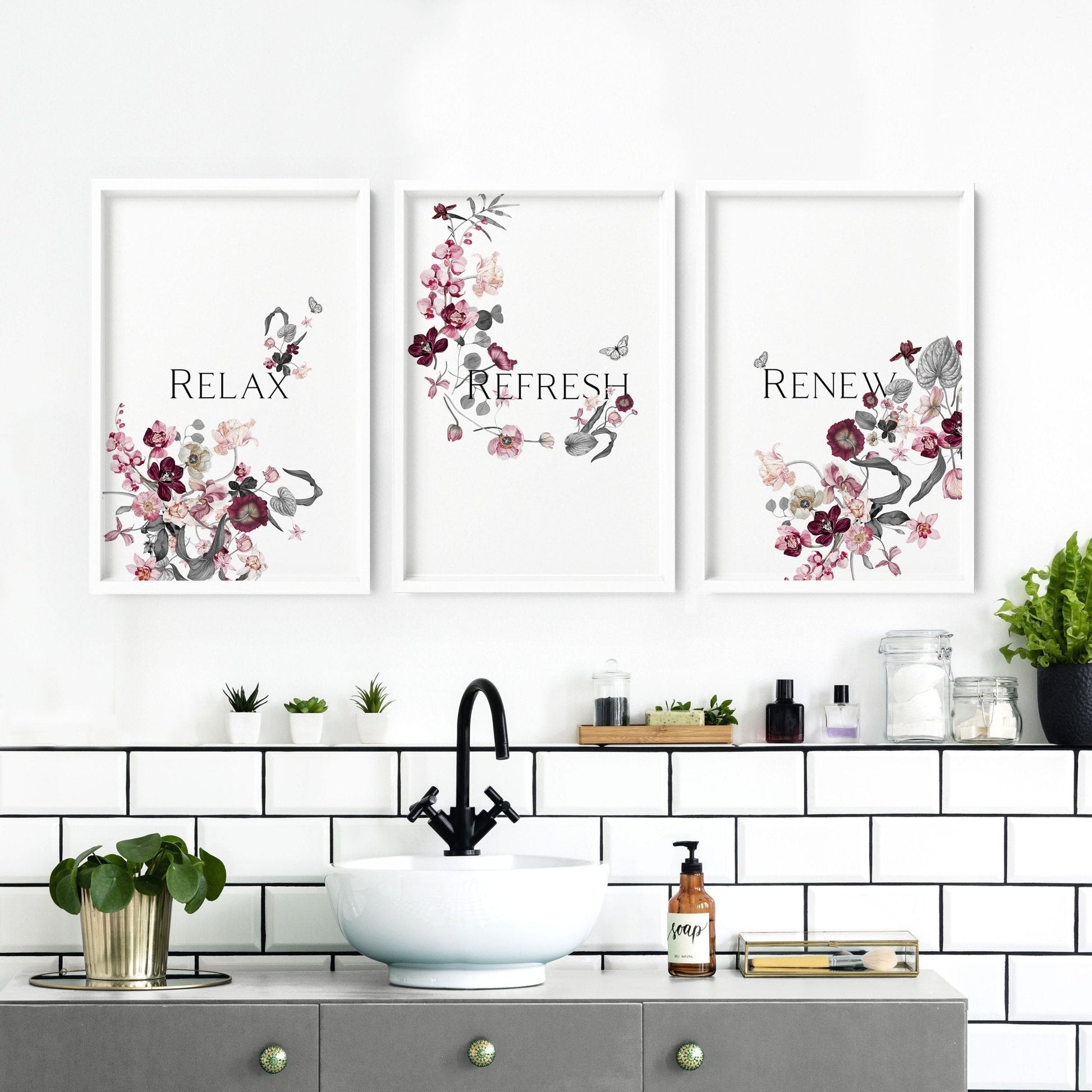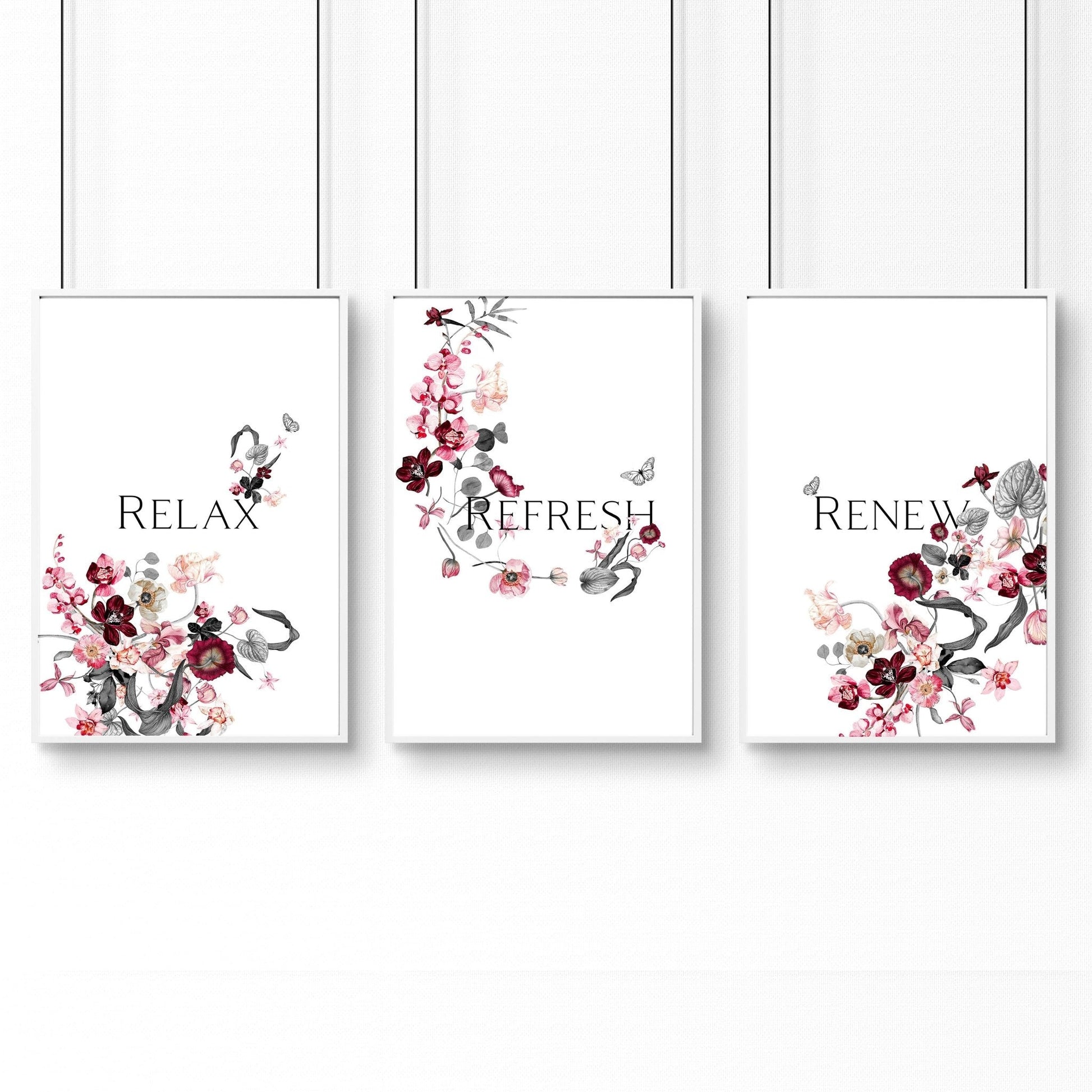 Transform your bathroom into a tranquil oasis with our charming set of three wall art prints. These prints showcase delicate shabby chic floral artwork in a palette of soft pink, deep burgundy, and soothing grey tones. Accompanied by the soothing quote "Relax, Refresh & Renew," they offer a gentle reminder to take a moment for self-care and rejuvenation.