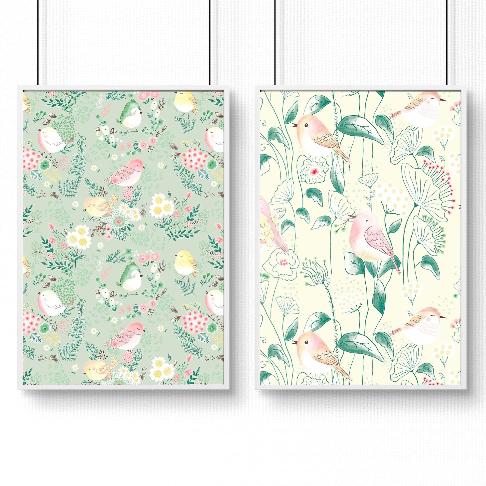 The prints beautifully depict a whimsical world of nature, where adorable birds and enchanting flowers come together to create a captivating scene. The soft and gentle tones of pink, ivory and sage green create a calming atmosphere, perfect for creating a serene environment for your little one.