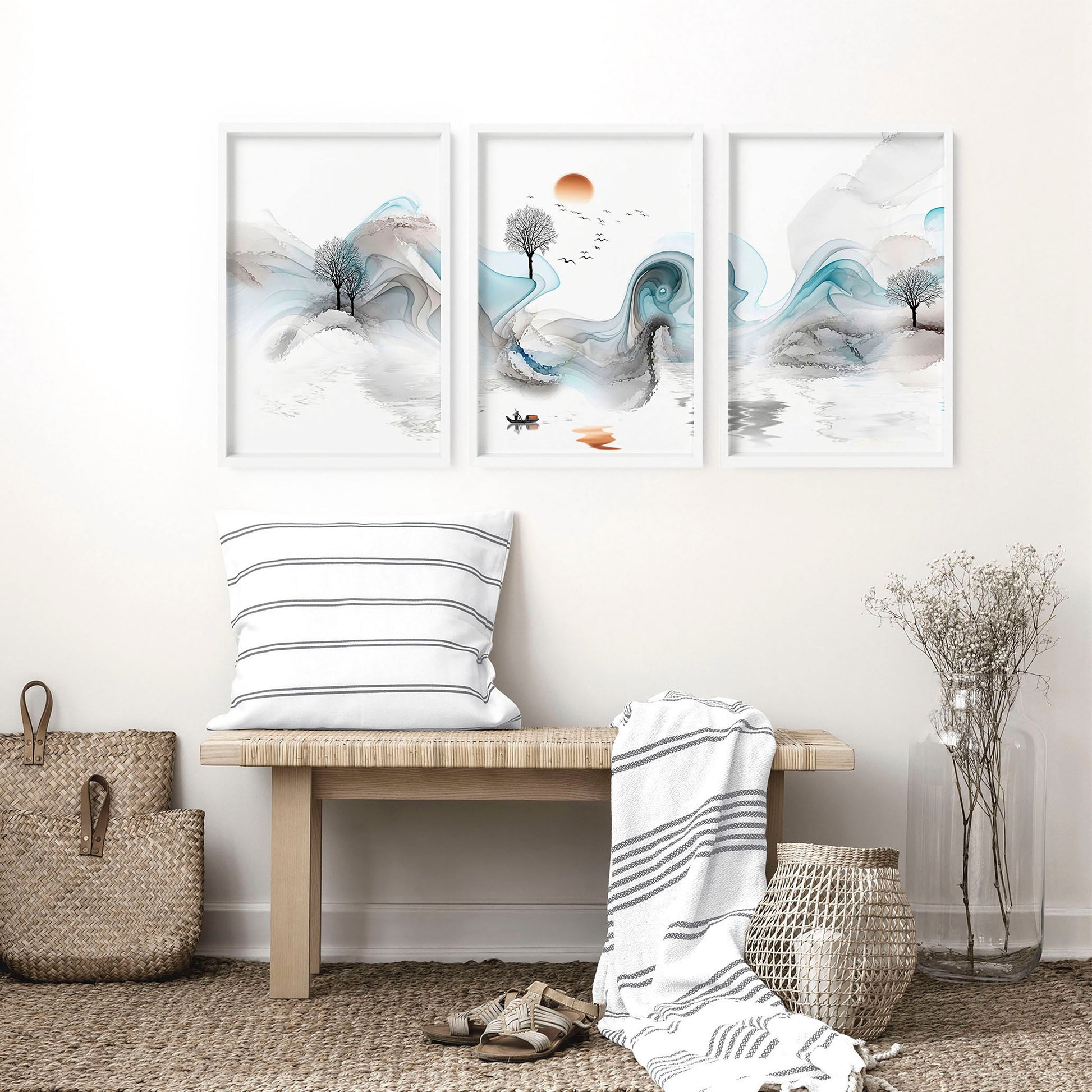 Create a harmonious and serene atmosphere in your living room with our Zen wall decor. This set of three wall art prints indeed features captivating, ethereal Japanese landscapes, adding tranquillity and natural beauty to your space.